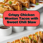 Keywords: Chicken wonton tacos, hoisin chicken tacos, crispy wonton shells, Asian-inspired tacos, coleslaw topping, sweet chili sauce, appetizer, main dish