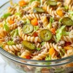 Keywords: Big Mac pasta salad, pasta salad recipe, ground beef pasta salad, Big Mac flavors, gluten-free pasta salad, potluck recipe, summer salad, healthy pasta salad, creamy pasta salad