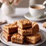 A white round plate holds six square cookie bars arranged in a pile on a white marbled surface, each bar showing two layers with a darker brown base and a lighter brown top layer with a crumbly texture, drizzled with a shiny caramel-colored sauce on top. The plate is slightly textured and in the background there is a white cup of coffee on a saucer with a spoon, and a blurred white vase with light pink flowers, creating a cozy setting. The colors are warm and inviting with soft light highlighting the glossy caramel drizzle. photo taken with an iphone --ar 4:5 --v 7