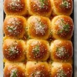 The image shows a tray with twelve golden brown dinner rolls arranged in a 3x4 grid. Each roll has a shiny, slightly glossy top sprinkled with green herbs and small white flakes, likely coarse salt or garlic bits. The rolls are close together, with light browning around the edges where they touch each other, and a soft, fluffy texture visible beneath the shiny crust. The tray is placed on a white marbled surface. Photo taken with an iphone --ar 4:5 --v 7
