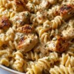 - Combine & simmer: Add the cooked rotini pasta and the cooked chicken back into the skillet. Toss everything thoroughly to coat the pasta and chicken evenly with the cheesy Cajun garlic sauce. Let it simmer for 2–3 minutes to meld the flavors.