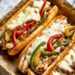 Three stuffed hoagie sandwiches lie side by side on brown parchment paper. Each sandwich has a top layer of melted white cheese covering pieces of cooked chicken, which are golden brown with a peppered texture. Under the chicken are strips of cooked bell peppers in red, yellow, and green colors, giving a mix of bright and soft textures. The sandwiches are held in soft, light golden hoagie rolls that cradle the fillings closely. The background is a white marbled texture with a white cloth partially visible on the left side. photo taken with an iphone --ar 4:5 --v 7