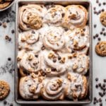 Delight in these soft, buttery Chocolate Chip Cookie Rolls—a unique hybrid of cinnamon roll dough filled with rich cookie dough and melty chocolate chips. Perfectly sweet and tender, these rolls are baked to golden perfection and topped with creamy cream cheese frosting for an irresistible treat.