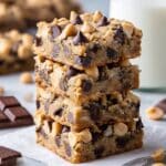 A stack of four thick square dessert bars rests on a white napkin over a white marbled surface, each bar showing a dense, golden-brown base filled with dark chocolate chips and topped with slightly glossy pale beige peanut butter chips, scattered peanuts, and chunks of chocolate, creating a textured top layer with nuts and melty chocolate pieces; the edges are slightly crumbly but firm, and the background features blurred pieces of chocolate and more peanuts, with a glass of milk nearby. photo taken with an iphone --ar 4:5 --v 7