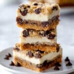 Keywords: cookie dough cheesecake bars, chocolate chip cheesecake bars, easy cheesecake dessert, layered cheesecake bars, graham cracker crust dessert