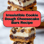 Deliciously rich Cookie Dough Cheesecake Bars featuring a buttery graham cracker crust, creamy cheesecake layer, and topped with soft, chocolate chip studded cookie dough. These bars combine the best of cheesecake and cookie dough in an easy-to-make dessert perfect for any occasion.