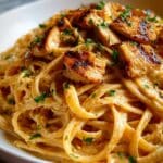 Cowboy Butter Chicken Linguine is a creamy, flavorful pasta dish featuring tender pan-seared chicken breasts in a rich garlic butter sauce infused with smoked paprika and a hint of spice from red pepper flakes. Tossed with linguine and finished with Parmesan cheese and fresh parsley, this dish delivers a comforting and satisfying meal perfect for any weeknight dinner.