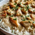 Creamy Smothered Chicken & Rice is a comforting and flavorful dish featuring juicy chicken thighs or breasts smothered in a rich, creamy sauce made from heavy cream, chicken broth, and a touch of Worcestershire sauce. This recipe is packed with savory depth from seared chicken and a homemade roux, served over fluffy rice for the perfect hearty meal.
