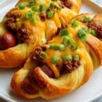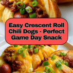 Crescent Roll Chili Dog Delights are a fun and easy-to-make snack or meal featuring savory hot dogs wrapped in flaky crescent roll dough, topped with hearty chili and melted cheddar cheese. Perfect for game day or casual get-togethers, these bite-sized treats combine classic flavors with a convenient handheld form.