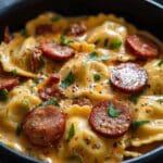 The image shows a close-up of a black pot filled with golden brown ravioli pieces and round slices of browned sausage mixed in a creamy sauce. The ravioli have a soft, slightly crispy texture with some herbs sprinkled on top, and the sausage slices have a rich reddish-brown color with a juicy look. Small green herbs are scattered evenly across the dish, adding a fresh touch of color. The dish is vibrant with a blend of creamy, warm tones and garnished with some black pepper cracks, making it look rich and savory. photo taken with an iphone --ar 4:5 --v 7