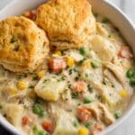 - Serve: Spoon the hot, creamy chicken pot pie filling into bowls and top each serving with a warm buttermilk biscuit for a delicious and comforting meal.