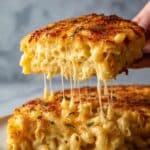 The image shows a close-up of a cheesy macaroni dish being lifted, with a white plate underneath. The top layer is golden brown and crispy with melted cheese bubbles, and below it are soft, creamy pasta noodles coated in rich cheese sauce. There are small green herb sprinkles on top, adding a touch of color. Strings of melted cheese stretch from the portion being lifted to the rest of the dish, showing gooey texture. The background is a white marbled surface, and a woman's hand is carefully holding the piece. photo taken with an iphone --ar 4:5 --v 7