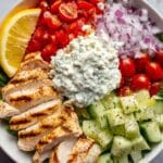 Keywords: Greek chicken bowl, air fryer chicken, tzatziki sauce, Mediterranean chicken recipe, healthy chicken bowls, quinoa chicken bowl, rice bowl, easy Greek recipe