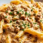 - Combine Pasta and Beef Mixture: Add the cooked penne pasta directly into the skillet with the beef mixture. Toss everything thoroughly to combine and evenly coat the pasta in the creamy sauce.