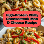 Keywords: Philly cheesesteak mac and cheese, high protein mac and cheese, creamy mac and cheese, ground beef recipe, comfort food, easy dinner, stovetop mac and cheese