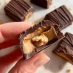 These Homemade Protein Snickers Bars are a nutritious and delicious snack featuring a creamy almond butter nougat base, a rich caramel layer studded with chopped almonds, and a smooth dark chocolate coating. Perfect for those craving a healthier version of the classic candy bar with added protein and wholesome ingredients.