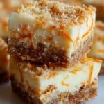 A close-up of two stacked square dessert bars shows three visible layers: the bottom layer is a textured, golden-brown crust with bits of carrot mixed in, the middle layer is a smooth, creamy white filling, and the top layer is a mix of cream and small pieces of orange carrot, sprinkled with a fine, crumbly brown topping. The bars have a slightly crumbly texture on the edges and a moist, rich look overall, with more similar bars blurred in the white marbled background. photo taken with an iphone --ar 4:5 --v 7