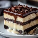 A close-up view of a three-layer dessert square on a white plate, placed on a white marbled surface. The bottom layer is dark, moist chocolate cake with a soft texture, followed by a thick middle layer of smooth, creamy pale beige custard that slightly drips over the cake edges. The top layer is a glossy, rich dark chocolate ganache, adorned with small, curly chocolate shavings scattered over the surface. A silver fork lies next to the dessert on the plate. Photo taken with an iphone --ar 4:5 --v 7