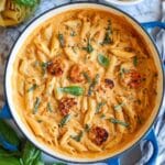 This Marry Me Shrimp Pasta is a flavorful, creamy dish featuring succulent extra-large shrimp sautéed in sun-dried tomato oil, tossed with gluten-free penne pasta, and enveloped in a rich sun-dried tomato and parmesan cream sauce, garnished with fresh basil for a deliciously romantic and comforting meal.