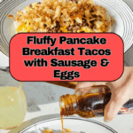 Keywords: Pancake Breakfast Tacos, breakfast tacos, pancake tacos, sausage breakfast, crispy potatoes, scrambled eggs, maple syrup, breakfast recipe