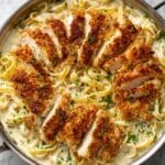 Parmesan Crusted Chicken with Alfredo is a delightful and satisfying dish featuring crispy, golden-brown chicken breasts coated with a flavorful Parmesan breadcrumb crust, baked to perfection, and topped with a rich, creamy homemade Alfredo sauce. Garnished with fresh parsley, this recipe is perfect for a comforting dinner that’s both elegant and easy to prepare.