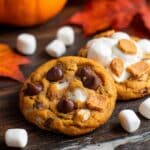 Keywords: pumpkin cookies, s’mores cookies, fall dessert, pumpkin spice cookies, marshmallow cookies, chocolate chip cookies, autumn treats, seasonal baking