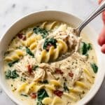 This Quick White Lasagna Soup is a comforting and creamy twist on classic lasagna flavors, delivered in a warm, hearty soup form. Featuring tender chicken, pasta, spinach, sun-dried tomatoes, and a luscious creamy broth thickened with half-and-half and cornstarch, it’s an easy, satisfying meal perfect for any day of the week. Finished with a trio of ricotta, Parmesan, and mozzarella cheeses to create a rich, cheesy texture reminiscent of traditional lasagna.