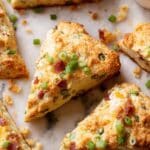 These Savory Bacon, Cheddar, & Scallion Scones are buttery, flaky, and packed with sharp cheddar cheese, crispy bacon, and fresh green onions. Perfect for breakfast or brunch, they offer a delicious blend of savory flavors, baked to golden perfection and topped with a light sprinkle of flaky sea salt.