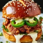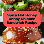 This spicy hot honey crispy chicken sandwich brings together juicy fried chicken coated in a flavorful batter, drizzled with a sweet and spicy hot honey sauce. Served on a toasted buttered bun with cheese, pickles, shredded lettuce, and a zesty spicy mayo, it’s a perfect blend of heat, sweetness, and crunch for an unforgettable meal.