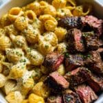 Steak Bites with Creamy Garlic Parmesan Shell Pasta Recipe