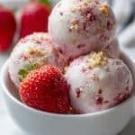The image shows a close-up of three round ice cream balls in a white bowl, with small red fruit pieces mixed inside, giving a pinkish-white color with a creamy texture. The top of each ice cream ball has a light sprinkle of crushed nuts or crumbs. Around the ice cream balls, there are three bright red strawberries with visible seeds, adding a fresh look to the scene. The background has a white marbled surface, softly blurred to keep focus on the bowl. Photo taken with an iphone --ar 4:5 --v 7