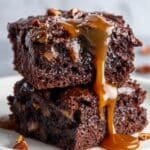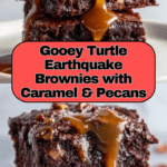 Turtle Earthquake Brownies are decadent, fudgy brownies loaded with gooey caramel sauce, rich semi-sweet chocolate chips, and crunchy chopped pecans. This indulgent dessert combines a classic chocolate brownie base with a luscious turtle topping, creating a perfect balance of sweet, nutty, and chocolate flavors. Ideal for special occasions or a delightful treat any time.