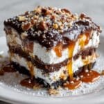 Turtle Lasagna Dessert is a rich and indulgent no-bake treat featuring layers of chocolate cookies, creamy sweetened cream cheese, whipped topping, and drizzles of caramel and chocolate fudge sauce, topped with crunchy chopped pecans. This make-ahead dessert is perfect for chocolate lovers looking for a quick, impressive dish that combines creamy, crunchy, and gooey textures in every bite.